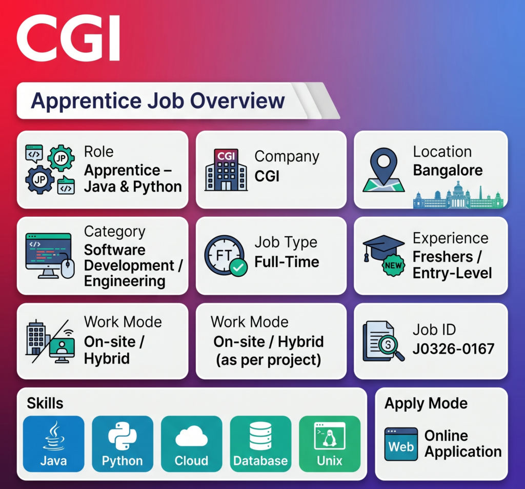 Breaking into the IT industry can feel confusing, especially when most roles expect experience from day one. That’s where apprentice opportunities make a real difference. The CGI Apprentice – Java & Python role in Bangalore is built for freshers who want hands-on exposure instead of just theory. If you’ve been learning Java or Python and are searching for your first real opportunity, this role gives you a chance to work on practical projects, understand industry workflows, and grow in a structured environment without unrealistic expectations.