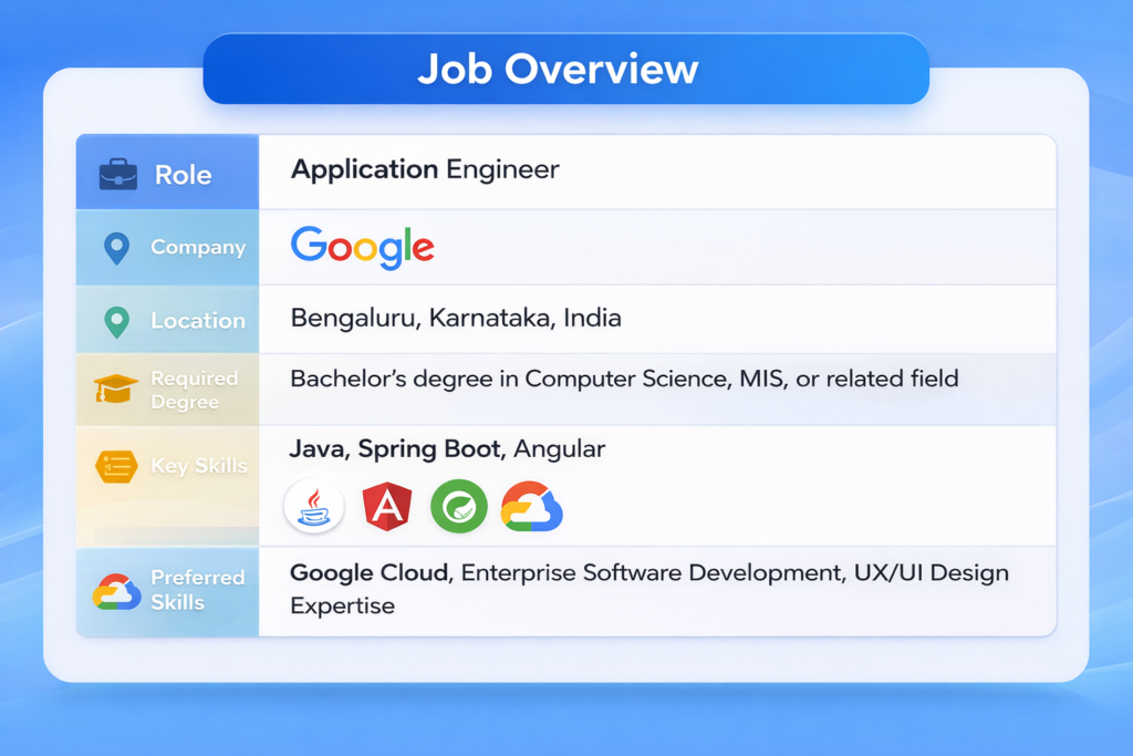 Are you ready to step into one of the most dynamic tech careers in Bengaluru? The Application Engineer role at Google isn’t just another job—it’s a chance to build real-world web applications that millions of people interact with daily. If you’re passionate about Java, Spring Boot, Angular, and creating solutions that scale, this opportunity is calling your name. In this guide, we’ll walk you through everything you need to know—from required skills to responsibilities, hiring tips, and even the perks of working at Google—all in a friendly, easy-to-digest way. Think of this as your personal roadmap to landing one of the most exciting tech roles in the industry.